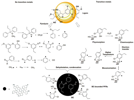First, the C-O and C-C covalent bonds of constituents of lignin are broken under heat, either via electron transfer by transition metals or not, to form free radical fragments, phenols, chinones, and other products of incomplete combustion. Simultaneously, the cleavage of the glucoside bonds of cellulose and hemicellulose that are present in biomass feedstocks occurs, causing depolymerization and the formation of other radicals. These first radicals can couple to form bio-oil, pyrolysis syngas (CO2, CO, CH3CH3, and CH4), and BC simultaneously or may abstract hydrogen from other molecules, forming further radicals [133,138]. Several chemical reactions can occur, including dehydration, decarboxylation with further emissions of CO2, CO, and H2O, aromatization, and intra-molecular condensation leading to the formation of the crystalline graphene structure and graphitic radicals. During pyrolysis, the elemental composition of biomass undergoes changes that cause mutations in the types of radicals that, upon entrapment onto the BCs’ surface and/or the formation of metal–radical complexes, form stable PFRs [24].