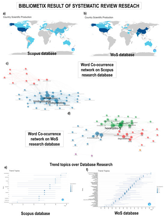 Sistematic review using Bibliometrix. (a) Country of Scientific Production of primariy literature published in Scopus databases from 2003 to 2023, countries in blue shows higher scientific production (N° of articles higher than 90) and light blue (N° of articles lower than 24) shows average scientific production. (b) Country of Scientific Production of primariy literature published in WoS databases from 2003 to 2023. Blue (N° of articles higher than 35) and light blue (N° of articles lower than 12) shows scientific production (c) Word co-occurrence network in Scopus databases from 2003 to 2023. It shows the key concepts and relationships among them. The central keyword is “biodegradation”, with consistent presence of keywords like “soils”, “water”, and “microbiology each color represents a cluster of word coincidence difrenciating 2 groups (red related to keywords of risk, human and journal and blue, related to biodegradation, trinitotuluene and bioremediation). (d) Word co-occurrence network in Scopus databases from 2003 to 2023, three cluster of word coincidence are separated by color with nucleous off cluster been, “toxicity”, “hexohydro-1”, “trinitotulene” for blue, green and red respectively. (e) Trend topics over database research in Scopus the terms “RDX” “HMX” and “TNT” are the mos frecuent and last over time (f) Trend topics over database research in WoS the terms “bacteria” “Biodegradation” and “trinitotuluene” are the mos frecuent and last over time. Database quality and query specificity are crucial in shaping our integrated review.