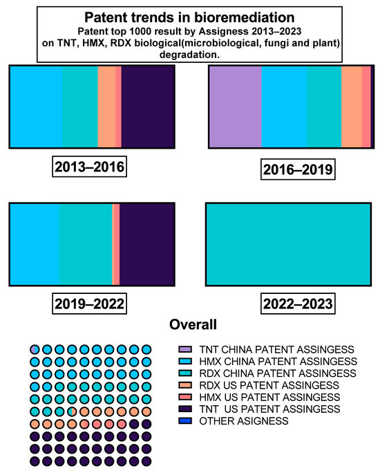 The research focused on identifying patents related to the bioremediation, degradation, or attenuation of explosives such as RDX, TNT, and HMX. The selection process followed specific criteria to ensure the relevance and appropriateness of the patents. The initial step involved searching the Google Patents database using keywords related to explosives and bioremediation. The keywords used included “explosives”, “TNT”, “RDX”, “HMX”, “degradation”, “bioremediation” and “recovery”, in a time frame from 2003 to 2023. Each search yielded more than 1000 patents, the database showed the tendency along time and publication and filled the general Supplementary Materials.