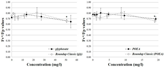In addition to herbicides that directly inhibit photosynthesis (e.g., atrazine), other active ingredients (e.g., glyphosate) can also affect photosynthesis and respiration processes through their effects on different metabolic pathways [90,91,123]. Based on our results, the pure glyphosate active ingredient did not result in a significant decrease in the photochemical efficiency of the PS II photochemical system compared to the control group up to a concentration of 109 mg/L. On the other hand, in the presence of POEA, a significant decrease was detected in the measured Fv*/Fp values even at a lower concentration of 50.6 mg/L (Figure 1). According to the measured Rfd* values, an increase was observed for both the pure active ingredient and the formulated herbicide preparation at low concentrations (glyphosate: 13.6–27.2 mg/L, Roundup Classic (glyphosate equivalent): 1.5–5.8 mg/L). However, the decrease in the Rfd* values was only observed after the exposure to the herbicide formulation in the tested concentration range (Figure 2).