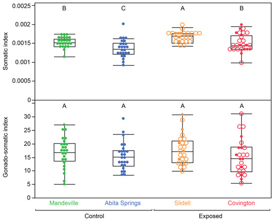 When the size metrics from subsequent tests were considered, it became apparent that, although we attempted to randomly sub-sample fish for body condition analysis, these fish were not representative. Specifically, in both control populations where additional fish were measured, the standard length was up to 11% smaller (Mandeville: F2,150 = 0.52, p = 0.5986; Abita Springs: F2,148 = 4.88, p = 0.0089) and the somatic index was up to 24% lower compared to fish from other analyses (Mandeville: t127 = 5.74, p < 0.0001; Abita Springs: t125 = 7.99, p < 0.0001). The inclusion of additional individuals in the control populations resulted in these fish having a greater somatic index than the respective exposed populations (Mandeville/Slidell: t151 = −2.35, p = 0.0198; Abita Springs/Covington: t150 = −3.24, p = 0.0015), in contrast to the result from the body condition analyses alone.