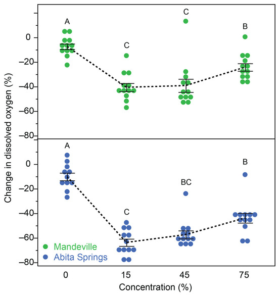 Biological oxygen demand measured from effluent-contaminated water estimated over 24 h. The change in dissolved oxygen for each concentration is represented as the mean and standard error of each measurement taken across three replicate bottles and four replicate days for each population. Colors represent the population of origin. Mean values are connected with a black dashed line to highlight changes. Letters (A, B, C) indicate statistical similarity, determined using Tukey HSD post hoc comparisons. In both populations, biological oxygen demand was greatest (most negative) at intermediate concentrations.