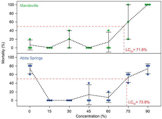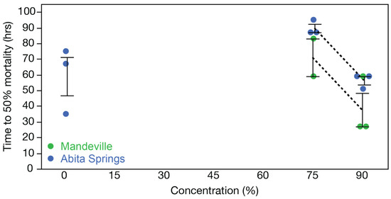 The LT50 of exposure in each concentration was similar between populations (Figure 5). Survival was high between 0 and 60% effluent-contaminated water, with 50% mortality only encountered at concentrations of 75% or above. As expected, the highest effluent-contaminated water concentration (90%) triggered the fastest population declines, with Mandeville fish enduring for 37.7 ± 18.5 h, and Abita Springs fish persisting for 56.3 ± 4.6 h. However, no significant differences in LT50 were observed in fish from the two populations following exposure to elevated sewage effluent concentrations (75%: t3 = −1.948, p = 0.147; 90%: t4 = −1.698, p = 0.165). Within each population, the LT50 in the Abita Springs fish was significantly lower for fish exposed to a 90% effluent-contaminated water concentration compared to those exposed to a 75% effluent concentration (t4 = 8.839, p < 0.001). In contrast, no significant differences in LT50 values were seen in the Mandeville fish exposed to either 75% or 90% effluent-contaminated water concentrations (t3 = 2.030, p = 0.135). Taken together, these results suggest that the effluent exposure tests were repeatable and that the strongest effluent-contaminated water concentrations are lethal in only 1–2 days.