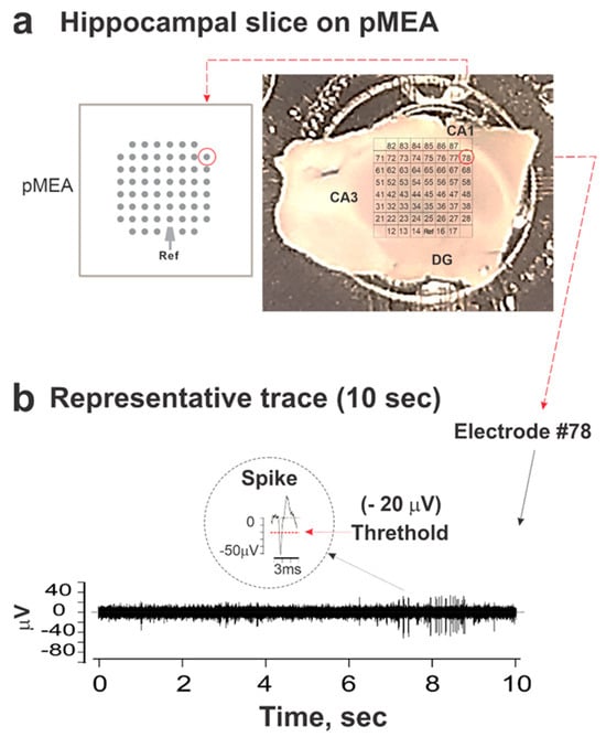 Recording of spontaneous network activity from mouse hippocampal slices on perforated microelectrode arrays (pMEAs). Mouse hippocampal slices were firmly secured on pMEAs using a dual-perfusion system. aCSF was perfused through each slice. (a) Although the slices were consistently placed on the 60 electrode arrays to record activity from the entire hippocampus, including CA1, CA3, and DG, the slices were not placed stereotactically. (b) A representative 10 s recording of spontaneous electrical spike activity (ESA) from electrode #78. Each spike event was identified as a signal with a Falling Edge that exceeded the threshold of −20 mV (red dashed line and arrow). A typical spike waveform of 3 ms is shown in the circle.
