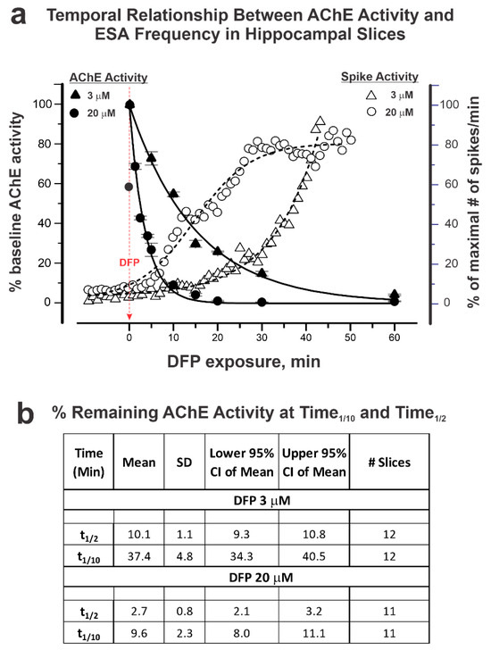 Temporal relationship between AChE activity and electrical spike activity (ESA) in hippocampal slices. AChE activity, measured using the Ellman assay, and ESA were assessed in acute hippocampal slices obtained from adult mice at varying times after the addition of DFP at 3 or 20 µM. (a) AChE activity (left y-axis; filled triangles and circles) and ESA (right y-axis; open triangles and circles), both shown as a % of the baseline activity prior to the addition of DFP. The baseline AChE activity range was 0.41–0.50 mmol/min/mg. Each time point represents the mean value of n = 5 independent AChE preparations, each performed in triplicate (totaling 11–12 slices from N = 28 mice). The ESA frequency (right y-axis) increased with exposure time and is presented as mean spikes/minute (% of maximum) from one representative slice exposed to 3 or 20 µM DFP (N = 24 and N = 17 active electrodes, respectively). (b) The times taken to achieve 50% and 90% inhibition of AChE (t1/2 and t1/10) were obtained by nonlinear regression fitting using OriginLab.