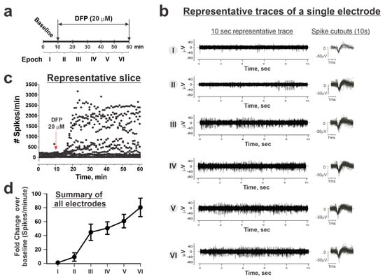 Based on these results, all subsequent slice experiments were performed with 20 µM DFP in order to limit the experiments to a total of 60 min (10 min baseline + 50 min with DFP perfusion). Figure 3a illustrates the experimental protocol used for further evaluating the temporal influences of DFP on ESA. The 60 min experiment was divided into six epochs, at 10 min/epoch (Figure 3a). Epoch I recorded 10 min of the baseline period prior to the addition of DFP to the aCSF perfusate and served as the basis for normalizing ESA for each active electrode. Epochs II–VI were recorded subsequent to the addition of 20 µM DFP to the aCSF perfusate. Figure 3b shows a representative 10 s recording from each epoch and the overlay of all spike cutouts from these 10 sec recordings. Figure 3c shows the temporal changes in ESA frequency of all electrodes detecting activity in a single slice. Epochs II–VI from each active electrode were normalized to their respective baseline activity (Epoch I) and reported as fold changes in the spike rate over baseline (Figure 3d). Statistical analyses of normalized changes in the ESA frequency are summarized in Table 3. DFP (20 µM) produced a mean 9.1-fold increase in ESA frequency relative to baseline within the first 10 min (p = 0.039, Table 3), whereas within the last epoch (Epoch VI), DFP increased the ESA frequency 67.1–93.6-fold (lower–upper 95% of mean, Table 3).