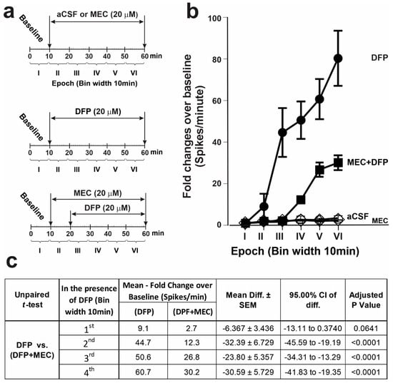 Mecamylamine (MEC), a non-selective noncompetitive antagonist of nAChRs, was included in the aCSF perfusate in the absence or presence of DFP (Figure 4a). The perfusion of MEC in the absence of DFP had no significant influence on the ESA frequency compared to the perfusion of aCSF alone (Figure 4b). The addition of MEC to the perfusate at the beginning of Epoch II, 10 min prior to initiating DFP perfusion (20 µM) in Epoch III, dampened the ESA frequency compared to the perfusion of DFP alone during Epochs II–VI (Figure 4a,b). MEC suppressed DFP-triggered ESA frequencies 3.3-fold (p = 0.064) during the first 10 min. In contrast, during subsequent epochs, MEC suppressed the DFP-triggered ESA frequency to an even greater extent (Figure 4b,c).
