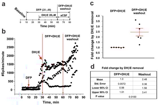 We next tested the reversibility of post-DFP perfusion with DHβE (20 µM), which is a selective competitive antagonist of nAChRs that multimerizes with the α4 nAChR subunit. When added to the perfusate 20 min after DFP, a time during which DFP-increased ESA frequency was obvious and accelerating (Figure 5a,b), DHβE significantly dampened, stopped, or reversed the DFP-mediated acceleration of ESA frequency measured from active electrodes compared with DFP alone (compare Figure 4b to Figure 5b). DFP is an irreversible blocker of AChE, whereas DHβE is a reversible antagonist of the α4 nAChR. Figure 5b shows that the washout of both DFP and DHβE from the pMEA chamber for an additional 20 min quickly unmasked the irreversible nature of AChE inhibition by DFP, resulting in an escalating ESA frequency. Comparing the ESA frequencies recorded during perfusion with DFP and DHβE to those recorded after the washout revealed a 2.5 ± 0.4-fold increase in ESA frequency, likely due to the enduring actions of DFP in the absence of DHβE (Figure 5c,d).
