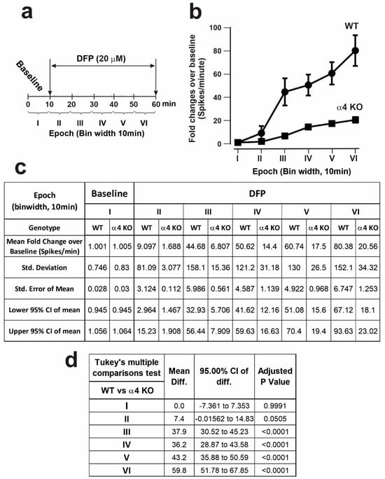 Greatly attenuated DFP responses in hippocampal slices from α4 nAChR KO mice. (a) Schematic of the experimental protocol in which DFP was added to hippocampal slices obtained from adult male wildtype (WT) or α4 nAChR KO mice. (b) The effect of genotype on DFP-triggered hyperactivity. Data are shown as the mean ESA ± 95% CI from Epochs II through VI, normalized according to the baseline (Epoch I). (c,d) The descriptive statistics and Tukey’s multiple comparison test results. Adjusted p values < 0.05 were regarded as significant. WT mice: N = 7, N = 10 slices, with a total N = 76 active electrodes. a4 KO mice: N = 6, N = 8 slices, with a total N = 68 active electrodes.