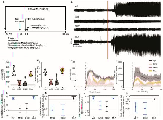 To confirm the physiological relevance of our findings in acute hippocampal slices, we evaluated the effects of pharmacological antagonism or the genetic deletion of nAChRs on behavioral seizures and seizure activity in a mouse model of acute DFP intoxication [27]. In our initial assessments of DFP-induced seizure behavior, mice pretreated with either the nonspecific nAChR antagonist MEC or the α4-selective antagonist DHβE, and α4 KO mice, displayed attenuated seizure behavior compared to controls (Veh)/WT (Supplementary Figure S1b). Moreover, broad nAChR receptor antagonism significantly attenuated seizure behavior when administered 10 min, but not 40 min, after DFP administration (Supplementary Figure S1d). To confirm these behavioral data, subsequent experiments monitored seizure activity using EEG. Representative EEG traces demonstrate that acute intoxication with DFP significantly altered EEG activity in a manner consistent with seizure activity (Figure 7b and Figure 8b). Quantitative analyses of these data confirmed that acute DFP intoxication triggered electrographic seizure activity. Specifically, in animals pretreated with the vehicle treatment, both the EEG amplitude, as measured by the root-mean-squared (RMS) value, and the EEG spike rate were significantly increased within several minutes after DFP injection, and both metrics remained consistently elevated relative to pre-DFP baseline values for hours post DFP exposure (Figure 7).