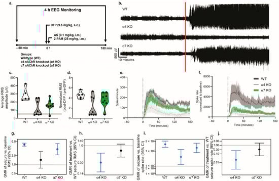 Key outcomes of the statistical analyses of EEG data included the RMS, normalized RMS, and spike rate. For the RMS and spike rate, there were three time epochs of interest: baseline (pre DFP), early seizure (first hour post DFP exposure), and late seizure (1–4 h post DFP exposure). For the normalized RMS, there were two epochs chosen for analysis, early and late seizure, both relative to the baseline period. Due to the repeated measurements over time within each animal, mixed-effects models, including animal-specific random effects, with key factors of interest including groups (Veh/WT, MEC, α4 KO, α7 KO, DHβE, MLA) and time epochs, were used to evaluate group differences. Any interaction between the two factors was considered and the Akaike Information Criterion was used to determine the best model. All outcomes were transformed using the natural logarithm to better meet the assumption of the model; spike rate values were first shifted by 0.1 prior to taking the log-transformation to account for zeros in the data. Specific contrasts for the within-group changes (as well as differences in the changes between the different treatment groups and the Veh/WT group) were constructed and tested with a Wald test. The Benjamini–Hochberg false discovery rate (FDR) was used to account for multiple comparisons. The results are presented as geometric mean ratios (GMRs) between the time epochs within each group and between the treatment groups and vehicle/WT controls. Point estimates of the ratios and 95% confidence intervals are presented in the figures. When the confidence interval for the GMR includes 1, there is no statistical evidence of a difference between the groups. All analyses were performed using SAS software, version 9.4, and alpha was set at 0.05; all reported results remained significant after the FDR procedure.
