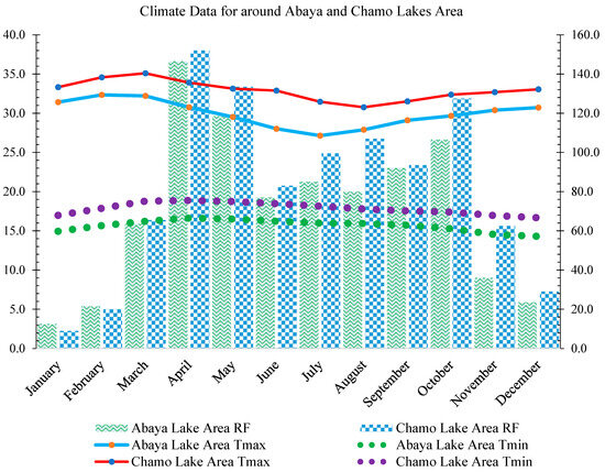 Annual climate data around Abaya and Chamo Lakes in South Ethiopia Rift Valley (1983–2020 average), where rainfall (RF) is in millimeters (mm) and temperature (T) is in degrees Celsius (°C) (Source: AMU-IUC meteorology station).