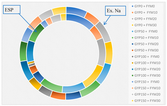 The sole GYP level and FYM level had a significant (p < 0.05) effect on the exchangeable Ca2+ and K+ (Table 2). In contrast, the combined application of gypsum and FYM level and their interactions had more highly significant (p < 0.05) effects on exchangeable Na+ and Mg2+ (Table 3). The amounts of exchangeable Na displaced in response to the applications of the treatments (GYP and FYM) from sodic soil are presented (Table 3). The data in Table 3 demonstrate that the application of treatments at different levels resulted in a significant release of exchangeable Na due to a chemical reaction between the cations in the chemical amendments and the Na in the soil exchange site. It is possible to infer a trend from the figure and table that the concentration of Ca2+ increased with the rate increasing of combined application of GYP and FYM, and sole application of FYM had a non-significant effect at p < 0.05 while sole application of gypsum had significant effect, and the highest exchangeable calcium (11.69 cmol (+) kg−1) was obtained by the application of 150% GYP levels. It is consumed in higher amounts, replacing more Na from the exchange site (Table 3 and Figure 3). However, when treatments were applied in combination rather than independently, exchangeable Na levels were significantly (p < 0.05) lower (Table 3). Thus, combined application of gyp150% with 30 t FYM and 20 t FYM ha−1 rate reduced exchangeable Na by 2.75% and 2.832.65% over the control, respectively. The application of 10 t FYM ha−1 and 100% GR rate of gypsum, followed by 0 t FYM ha−1 and 100% GR rate, resulted in a relatively maximum reduction of 95.8% of ex. Na over untreated composite sodic soil and 3.05% of exchangeable Na over the control, respectively (Figure 3). The decrease in exchangeable Na from 4.12 to 2.77 cmol (+) kg−1 in this study is likely due to the change in concentration of Ca2+ from 7.15 to 11.69 cmol (+) kg−1 (Table 3). This is because Ca2+ and Na+ compete for exchange sites on the soil colloid [84]. When the concentration of Ca2+ in the soil solution is increased, more Ca2+ will be adsorbed onto the exchange sites, displacing Na+ [85]. This approach is beneficial as Na+ can have an adverse impact on the soil’s properties and crop growth [20,86]. High levels of exchangeable Na can lead to soil dispersion, reducing water infiltration and aeration. Exchangeable Na can also be toxic to plants, especially at high concentrations [9,87,88]. The study results suggest that increased Ca2+ concentration effectively decreases exchangeable Na in the soil [89,90]. This can have several positive benefits for soil health and crop production [91].