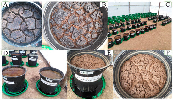 Initial soil for the incubation and leaching study in dark black color (A); incubated soil for three months (90 days) (B); experiment set up by Completely Randomized Design (CRD) (C); leaching incubated sodic soil for one month (28 days) (D); reclaimed sodic soil in light brown color at the top and leachate in dark black color at the bottom of the pot concerning last completed leaching pore volume water (E); reclaimed sodic soil after three months incubation and the one-month leaching study (F).