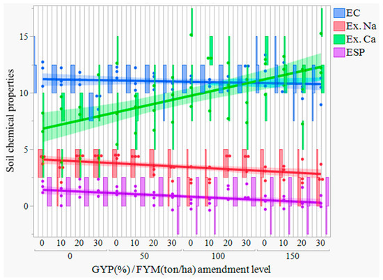 Prediction of soil exchangeable sodium percentage (ESP) for maintaining quality of soil chemical properties show differences among the treatments depending on different levels of amendment contributions, and coefficients of determination in the regression models are indicated in Table 5. The study shows that the sodic soil treatment effect of ESP (R2 = 0.95) alone determines the optimum treatment level required to displace exchangeable sodium from the exchange site. The best estimator models for ESP using treatment level for sodic soil were ESP = 1.65–0.33 gyp for sole application of gypsum and ESP = 1.65–0.33 gyp + 0.28 FYM for combined application of gypsum with farmyard manure, represented by gyp100% and gyp100% + fym10 ton/ha treatment levels, respectively (Table 5). Moreover, high dimensional variations were observed among the treatments. Consistently, our study identified negative linear relationships between the combined applied gypsum with farmyard manure levels and ESP, exchangeable Na+, and EC. In contrast, positive relationships were observed between gypsum (GYP) plus farmyard manure (FYM) levels and exchangeable Ca2+ (Figure 5). Applying gypsum and farm yard manure together could have several beneficial effects on soil, including reducing ESP, exchangeable Na+, and EC and increasing exchangeable Ca2+ [121,122,123]. These effects are likely because gypsum is a source of calcium, which can help to displace sodium from the soil exchange complex [123]. Farmyard manure is a source of organic matter, which can improve soil structure and increase the cation exchange capacity (CEC) of the soil [92,124,125]. A higher CEC means that the soil can hold more cations, such as calcium, which can help to improve soil nutrient availability and reduce leaching [126].