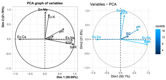 PCA has been used in a number of studies in the literature to assess sodic soils and reclaimed sodic soils [127,128], and the findings of this study show that relationships between the investigated variables of the reclaimed sodic soil and each combination amendment (GYP + FYM) could be established. Figure 6 shows the results of the principal components (PCs) analysis of the combined application of gypsum and FYM on the chemical properties of reclaimed sodic soil. The results showed three main principal components (PCs) with eigenvalues greater than 1 which were considered; the other PCs were neglected. These three PCs explained 86.25% of the studied soil chemical properties’ variability: 50.09%, 21.78%, and 14.38% for PC1, PC2, and PC3, respectively. The first principal component (PC1) represented 50.09% of the total variance of the data and showed positive correlations with the following soil variables: ESP, SAR, Ex. Na, and pH. These ESP, SAR, and Ex. Na soil variables were essential contributions, shown in bold in Table 6 and light blue in Figure 6, to PC1. However, negative correlations and essential contributions were verified for the exchangeable Ca variables, shown in bold in Table 6 and light blue in Figure 6 to PC1. Positive correlations and essential contributions were observed for Ex. K and Ex. Mg, with the second component (PC2) explaining 21.78% of the data variation in the exchange site, while PC3 explained 14.38%; positive correlations were observed for pH and EC (Figure 6 and Table 6). The PCA biplot also revealed that exchangeable Na, SAR, and ESP were strongly positively correlated to each other, while the less strong correlations to EC, pH, Ex. K, and Ex Mg were strongly negatively correlated to Ex.Ca (Figure 6 and Table 6). The variations in the exchangeable complex, soil composition, and soil solution that are confirmed in each treatment are correlated with the changes in the correlation patterns for PC1, PC2, and PC3.