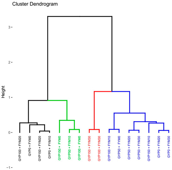 Cluster dendrogram (Ward’s method) of reclaimed sodic soil chemical properties concerning different gypsum and farmyard manure treatments under incubation and leaching study. Where: different color lines have noted that assuming the treatment levels and the reclaimed soils within a cluster have similar properties, they require similar application of the treatment levels and the same management.