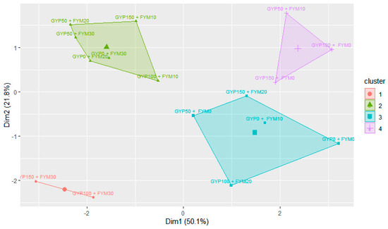 The K-means cluster analysis based on the combined amendments separated the variance of treatments on the first principal component (PC1) and second principal component, explaining 50.09% and 21.78%, respectively (Figure 8). The combined treatments from cluster 1 in red and cluster 2 in green were located on the left bottom and top side of the PCA plane, respectively. Cluster 3, in blue, and cluster 4, in purple, treatments were in the right bottom and top of the PCA plane and did not differ much.