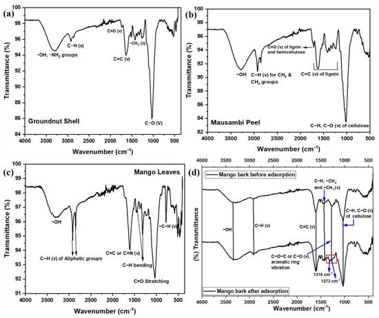 Figure 1a–d show the FT-IR spectra for GS, MP, MBARK, and ML. In all of the adsorbents, the distinctive common bands at around 3330 cm−1 confirm the presence of the -OH functional group, peaks at around 2923 cm−1 indicate the presence of -CH groups, and C=C groups identified at around 1646 cm−1 are due to the presence of lignin and cellulose in all adsorbents []. The peak around 1023 cm−1 represents the presence of C-O bonds for all the adsorbents. The C=O stretch in GS and MP is found at 1738 cm−1, whereas in ML, this peak is at 1039 cm−1 [,]. The -CH2 bending in GS is characterized at 1423 cm−1. Thus, from the FT-IR spectra, we can confirm that all the biowastes (adsorbents) are rich in lignin, cellulose, and hemicellulose content [,].