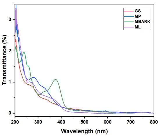 UV–Vis spectra of aqueous solution of Groundnut Shell (GS), Mosambi Peel (MP), Mango Bark (MBARK), and Mango Leaves (ML).