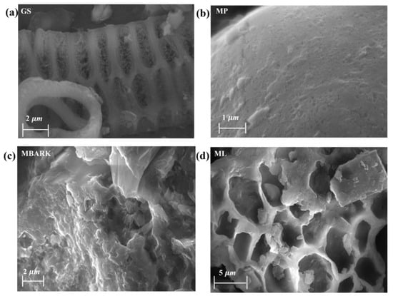 SEM images of the adsorbents (a) GS, (b) MP, (c) MBARK, and (d) ML.