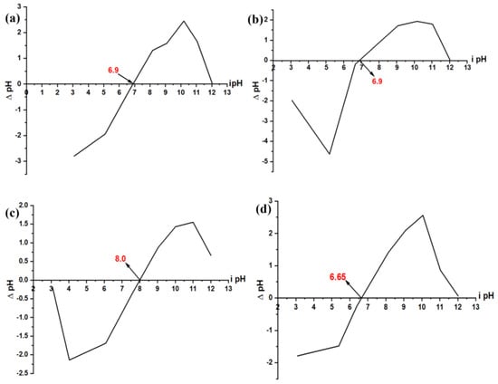 The PZC values for GS, MP, MBARK, and ML were found to be 6.9, 6.9, 8.0, and 6.6, respectively (Table 2). The inference from this PZC analysis is that when the pH values of the aqueous solution are less than the PZC of adsorbents, then the material exhibits a positive charge on its surface, while at pH value more than that of PZC, then the surface has a negative charge. At pH = PZC, no charge is present on the surface of the adsorbent. From the PZC values it was observed that MBARK exhibits the highest PZC compared to all adsorbents. The PZC of any adsorbent is very crucial in determining the adsorption mechanism based on the charge on the adsorbent at a particular pH. It can also be used to predict the optimum pH for a desired analyte to be removed. Figure 4a–d show all the PZC plots for all the adsorbents.