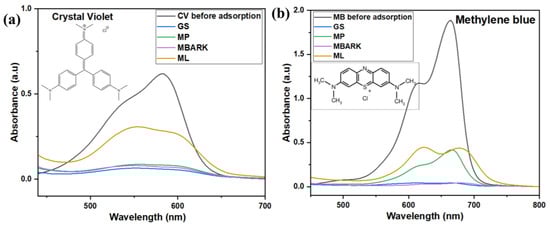 Figure 2 shows the UV–Vis spectra of the adsorbents. The UV spectra of the adsorbents were recorded to check that the adsorbents were not absorbing in the wavelength area corresponding to the CV, MB, RhB, and MG dyes, i.e., in the range from 450 nm to 700 nm. From Figure 2, we can conclude that the adsorbents do not show any peak in the range of the dyes, i.e., from 450 nm to 700 nm, thus causing no interference during the adsorption analysis.