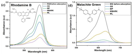 The different biowastes collected were evaluated for the adsorption of various cationic dyes. Figure 5a–d show the UV–Vis spectra of the adsorption of the CV, MB, RhB, and MG. As observed from the spectral results, a drastic reduction in the absorbance values indicates the absorption of dye by the adsorbents. Table 3 represents the % removal of all four dyes by the biowaste-derived adsorbent. From the (%) removal values, it was observed that both GS and MBARK exhibit good overall adsorption efficiency for almost all the dyes. The maximum removal of dyes is exhibited by MBARK. It was found to remove 98.08%, 78.85%, and 98.18% of MB, RhB, and MG, respectively. It was also found that GS exhibits a remarkable removal efficiency of 97.78, 90.39, and 97.3% for the MB, CV, and MG dyes, respectively. Similar mono-component dye removal has been explored using similar biowastes like groundnut shells, neem bark, mango leaf powder, etc. [,,]. The previously reported studies involve either activation of the adsorbent, which adds to the cost, high adsorbent dosage, or more time consumption as compared to the present study. Moreover, dye removal, as a single analyte system only, has only recently been attempted.