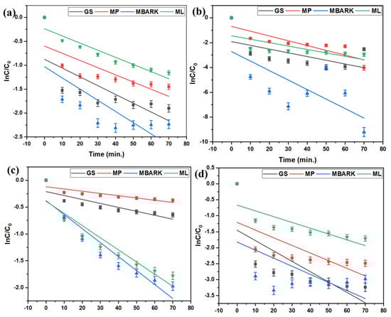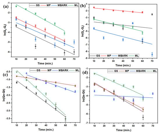 Pseudo −first −order kinetic model for removal of dyes using all four adsorbents: (a) CV, (b) MB, (c) RhB, and (d) MG dyes (adsorbent dosage = 1 mg/mL, dye concentration = 10 mg/L, total contact time = 70 min).