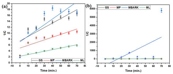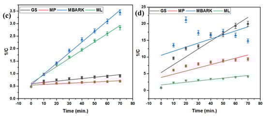 Second−order kinetic model for removal of dyes using all four adsorbents (a) CV, (b) MB, (c) RhB, and (d) MG (adsorbent dosage = 1 mg/mL, dye concentration = 10 mg/L, total contact time = 70 min).