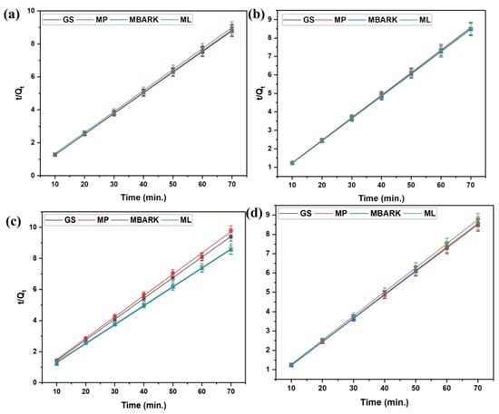 Pseudo −second −order kinetic model for removal of dyes using all five adsorbents: (a) CV, (b) MB, (c) RhB, and (d) MG dyes (adsorbent dosage = 1 mg/mL, dye concentration = 10 mg/L, total contact time = 70 min).