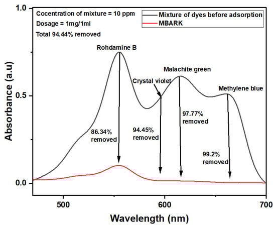 To determine the ideal dosage for the removal of a mixture of dyes, the effect of adsorbent dosage on the adsorption of dyes was studied. Dosage studies were performed by taking 0.25, 0.5, 1, and 2 mg/mL in a 10 mL dye mixture solution. Figure 11b depicts the bar graph for removal at different dosages of 0.25 mg/mL, 0.5 mg/mL, 1 mg/mL, and 2 mg/mL. MBARK showed an overall removal of 86.08%, 91.98%, 94.98%, and 94.34% for 0.25 mg/mL, 0.5 mg/mL, 1 mg/mL, and 2 mg/mL of adsorbent dosage, respectively. The % removal increased from 86.08% to 94.98% with an increase in adsorbent dosage from 0.25 mg/mL to 1 mg/mL. This can be attributed to the increase in adsorption sites with an increase in dosage. It can also be noted that the removal % remained almost the same when the adsorbent was increased to 2 mg/mL from 1 mg/mL, which indicates agglomeration of the adsorbent particles. Similar results have been reported by Jha et al. []. From all the results, the optimal dosage was determined to be 1 mg/mL and was kept the same for all the studies.