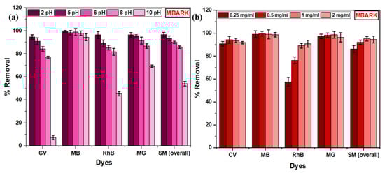 Adsorption studies were conducted at pH of 2, 4, 7, 8, and 10 to investigate the effect of pH on adsorption efficiency. The pH of a dye solution is an essential factor that affects the adsorption study as it affects the chemistry between adsorbate and adsorbent []. The overall % removal by MBARK for the mixture of dyes is 96.69%, 93.52%, 90.08%, 85.88%, and 54.10% for 2, 5, 6, 8, and 10 pH values, respectively. The bar graph for removal of each dye at a different pH is shown in Figure 11a. The highest removal for almost all the dyes was achieved at a pH of 2. At this pH, the adsorbent surface was found to have a positive charge on its surface as inferred from PZC. Thus, this rules out the possibility of adsorption through electrostatic attraction (due to like charges of dye and adsorbent), and the adsorption can probably be due to an ion-exchange mechanism []. Another possibility for favored adsorption may be the modification of the adsorbent or dye molecule (due to protonation or deprotonation) at a particular pH, which causes a shift in the pH value of the analyte solution. The UV–visible spectra of individual dyes at a different pH have been taken to monitor the structural changes (Figure S2). The shift in pH after adding the adsorbent (if >PZC) may cause electrostatic interaction between the positively charged dye and negative adsorbent surface. No specific change in % removal for MB, CV, and MG [,] was found during the entire pH range, whereas, in RhB, when the pH is increased, the % removal decreases. The reason for this decrease in RhB may be due to the Zwitter ionic structure or electrostatic repulsion between the dye molecule and adsorbent in basic medium []. Thus, to summarize, the adsorption process of the studied cationic dyes is mostly governed by ion exchange in acidic pH (when the adsorbent is positively charged) and electrostatic interaction in basic medium (when the adsorbent is negatively charged). Other forces like hydrogen bonding and π–π interaction also participate in the adsorption process, which is discussed in Section 3.2.6.