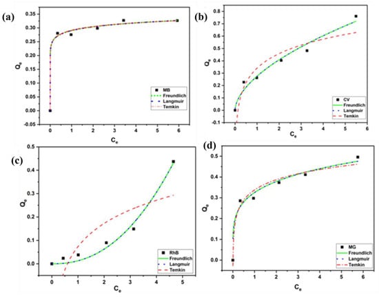 The non-linear fitting was performed for all the isothermal data obtained, as shown in Figure 12. The values of all the isothermal constants derived from the fitting are shown in Table S2 (Supplementary Materials). The results showed that the Langmuir isotherm model provided the closest fit to the data (R2 = 0.99) for all the dyes. This suggests that the adsorption occurs at a specific homogeneous site and is limited to one layer only. Further, no more adsorption occurs once this layer is formed. The observations are in agreement with the results obtained in the kinetics study, confirming the possibility of chemisorption. However, for CV, MB, and RhB, the values of R2 for Freundlich and Langmuir are close to each other hinting at the chance of the formation of a multi-layer during the adsorption process.
