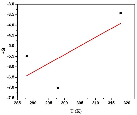 The simultaneous removal of dye was performed at three different temperatures (288 K, 298 K, and 318 K) to study the effect of temperature on the performance of MBARK. The data were further plotted to derive the values of enthalpy (ΔH) and entropy (ΔS) from the value of ΔG, as shown in Figure 13. The value of ΔG was calculated using Equation (1). From the calculated ΔG value, a graph of ΔG vs. temperature was plotted according to Equation (2), as shown in the figure.