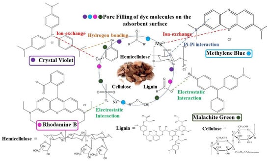 Keeping in view the same, in the present study, we applied a low-cost adsorbent from the rapid remediation of noxious dyes, namely, Crystal violet, Methylene blue, Rhodamine B, and Malachite green from a single and multi-component aqueous system in order to assess the removal efficiency of the developed adsorbent. The expected simultaneous presence of these dyes is between 10 and 50 mg/L in real wastewater. The functional groups present on the surface of dyes (-RNH2, -SO3H, -COOH, and aromatic groups) and adsorbents are expected to interact with each other through hydrogen bonding, ion exchange, complexation, electrostatic forces, etc., occurring at the water (dye solution)–solid (adsorbent) interface, resulting in adsorption. Further, the impact of effective parameters such as pH, adsorbent dosage, contact time, etc., on the adsorption efficiency of the developed adsorbent was also investigated.