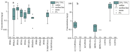- Dalahmeh, S.; Tirgani, S.; Komakech, A.J.; Niwagaba, C.B.; Ahrens, L. Per- and polyfluoroalkyl substances (PFASs) in water, soil and plants in wetlands and agricultural areas in Kampala, Uganda. Sci. Total Environ. 2018, 631–632, 660–667. [Google Scholar] [CrossRef] [PubMed]