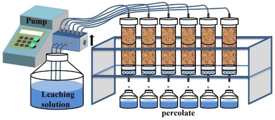 Deionized water was injected from the bottom outlet using a peristaltic pump (Rongbai, Baoding, China) to saturate the soil column, and then it was allowed to equilibrate for 7 days (Figure 1). After equilibration, continuous leaching was conducted by adding a leachate solution from the top to the bottom of the soil column at a constant rate (0.38 mL/min) using a peristaltic pump. The leaching process continued for 144 h, using a total of 3283.2 mL of the leachate solution, simulating a rainfall of approximately 4647 mm. The leachate solution was prepared using deionized water obtained from a water purification system (HHitech, Shanghai, China). A collection bottle for the leachate was placed at the bottom of the soil column, with collection intervals set at 24 h. The collected leachate samples were filtered through a 0.45 μm hydrophilic filter membrane and stored in centrifuge tubes. The concentrations of Cd and As in the leachate were determined using ICP-MS (Agilent, Santa Clara, CA, USA).