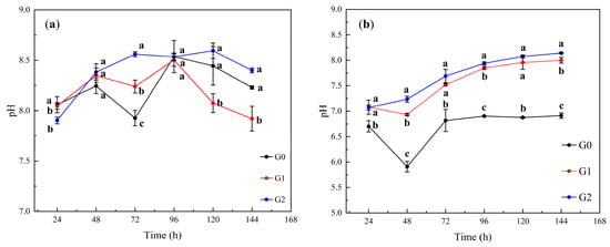Soil leachate pH. (a): Soil leachate pH of QD (alkaline) soil. (b): Soil leachate pH of JLG (acidic) soil. G0, G1, and G2 represent the addition of Fe-CGS at concentrations of 0.0 wt%, 1.0 wt%, and 2.0 wt%, respectively. Error bars represent the standard deviation of the mean (n = 3). Different letters indicate significant differences (p < 0.05).
