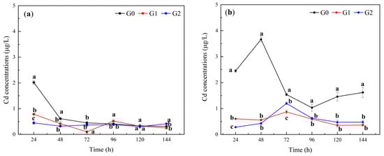 Soil leachate Cd concentrations. (a): Cd concentration in QD (alkaline) soil leachate. (b): Cd concentration in JLG (acidic) soil leachate. G0, G1, and G2 represent the addition of Fe-CGS at concentrations of 0.0 wt%, 1.0 wt%, and 2.0 wt%, respectively. Error bars represent the standard deviation of the mean (n = 3). Different letters indicate significant differences (p < 0.05).