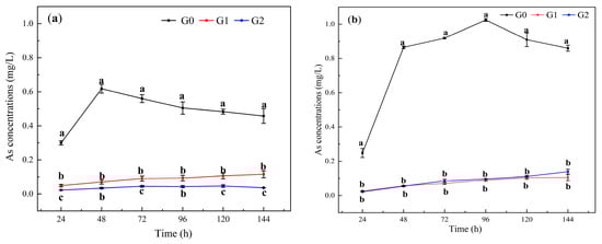 Soil leachate As concentrations. (a): As concentration in QD (alkaline) soil leachate. (b): As concentration in JLG (acidic) soil leachate. G0, G1, and G2 represent the addition of Fe-CGS at concentrations of 0.0 wt%, 1.0 wt%, and 2.0 wt%, respectively. Error bars represent the standard deviation of the mean (n = 3). Different letters indicate significant differences (p < 0.05).