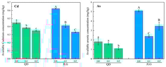 Contents of effective Cd and As states in co-polluted soils after leaching experiments. QD and JLG denote alkaline and acidic soils, respectively. G0, G1, and G2 denote the additions of 0.0 wt%, 1.0 wt%, and 2.0 wt% of Fe-CGS, respectively. Error bars indicate the standard deviation of means (n = 3), and different letters indicate significant differences (p < 0.05).