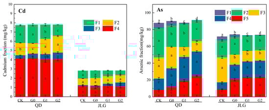 Fraction analysis of Cd and As in co-polluted soil. QD and JLG denote alkaline and acidic soil, respectively. G0, G1, and G2 denote the addition of Fe-CGS at 0.0 wt%, 1.0 wt%, and 2.0 wt%, respectively. CK denotes the content of different forms of Cd and As in the unleached soil. Error bars indicate standard deviation of means (n = 3), and different letters indicate significant differences (p < 0.05).