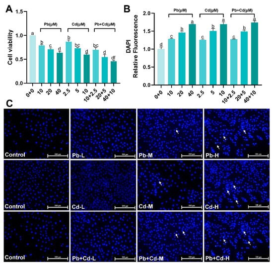 Effects of Pb and Cd on cytotoxicity. (A) Cell viability. (B) Quantitative analysis of DAPI fluorescence intensity in the BRL-3A cells. (C) Apoptosis was measured by using DAPI staining in the BRL-3A cells (scale bar = 100 μm). Blue-fluorescent dots indicate apoptotic vesicles. Arrows indicate that the nucleus undergoes cleavage and shrinkage. The data are expressed as the mean ± SD (n = 3). Bars with different letters are significantly different (p < 0.05).