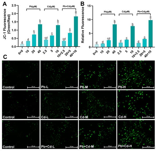 Effects of Pb and Cd on ROS and MMP level in BRL-3A cells. (A) Fluorescence quantification of MMP in BRL-3A cells after exposure to Pb and Cd. Decrease in MMP indicated by the shift from red to green fluorescence of JC-1. (B) Fluorescence quantification of ROS in BRL-3A cells after exposure to Pb and Cd. (C) The ROS expression level of the BRL-3A cells after Pb and Cd exposure (scale bar = 100 μm). The green fluorescence revealed the level of ROS. The data are expressed as the mean ± SD (n = 3). Bars with different letters are significantly different (p < 0.05).