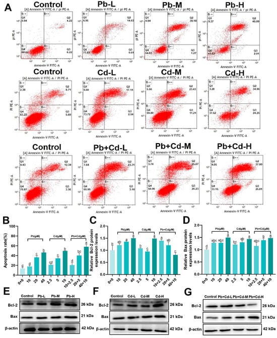 Effects of Pb and Cd on apoptosis in BRL-3A cells. (A,B) Annexin V-FITC flow analysis and the percentage of apoptotic cells per total population was detected. (C–G) The protein levels of apoptosis-related genes (Bcl-2, Bax). The data are expressed as the mean ± SD (n = 3). Bars with different letters are significantly different (p < 0.05).