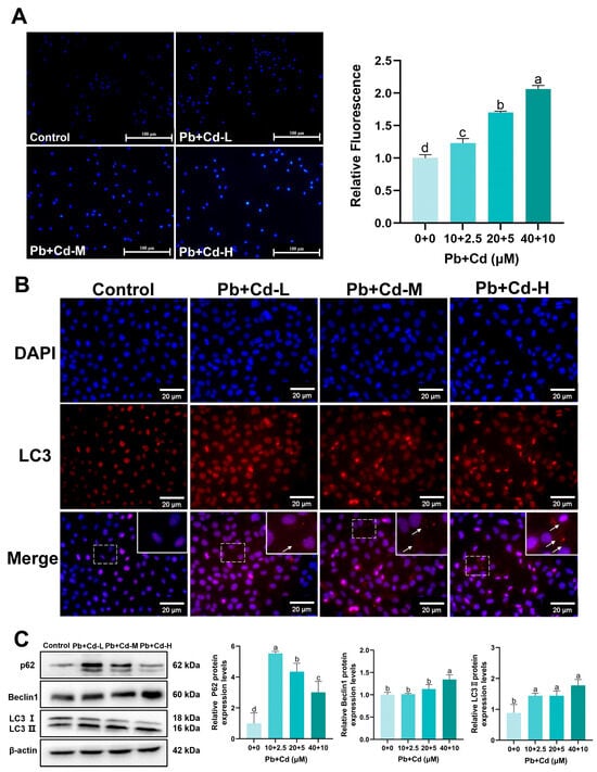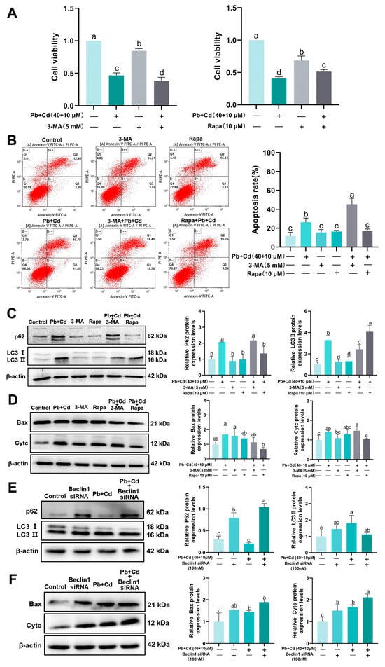 We performed experimental groups: (1) control group (Control), 10 μM Pb group (Pb-L), 20 μM Pb group (Pb-M), 40 μM Pb group (Pb-M), 2.5 μM Cd group (Cd-L), 5 μM Cd group (Cd-M), 10 μM Cd group (Cd-H), 10 μM Pb + 2.5 μM Cd group (Pb + Cd-L), 20 μM Pb + 5 μM Cd group (Pb + Cd-M), 40 μM Pb + 10 μM Cd group (Pb + Cd-H) for 12 h; (2) control group (Control), 40 μM Pb + 10 μM Cd group (Pb + Cd), 5 mM 3-MA group, 10 μM Rapa group, 40 μM Pb + 10 μM Cd + 5 mM 3-MA group (Pb + Cd + 3-MA), 40 μM Pb + 10 μM Cd + 10 μM Rapa group (Pb + Cd + Rapa) for 12 h; (3) control group (Control), 40 μM Pb + 10 μM Cd group (Pb + Cd), 100 nM Beclin1 siRNA group, 40 μM Pb + 10 μM Cd + 100 nM Beclin1 siRNA group (Pb + Cd + Beclin1 siRNA).