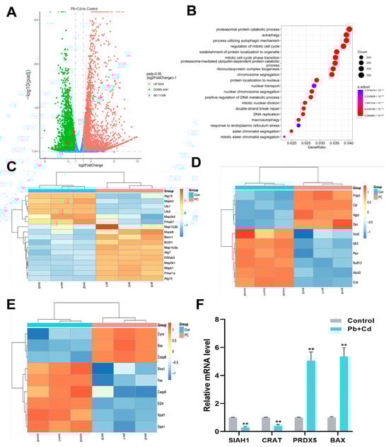 Transcriptome analysis of BRL-3A cells after Pb and Cd co-staining. (A) Volcano 20 plot of DEGs. (B) Scatterplot of Go enrichment analysis. (C–E) Heatmap of genes associated with the autophagy–peroxisome–P53 pathway. (F) Correlation of expression level analyzed by qRT-PCR with data obtained using RNA-Seq platform. The data are expressed as the mean ± SD (n = 3). ** p < 0.01.