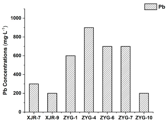 The minimum inhibitory concentration (MIC) values of these endophytic bacteria isolated from A. adenophora were determined in response to Pb exposure (Figure 2). All the selected endophytic strains exhibited a high level of tolerance to lead ions, with MIC values ranging from 200 to 900 mg·L−1. Among these isolates, ZYG-4, belonging to the genus Sphingomonas, showed the highest tolerance to Pb, tolerating up to 900 mg·L−1 of lead.