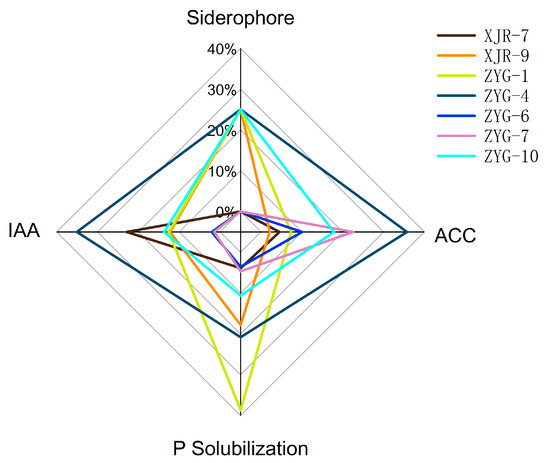 The PGP traits of all the isolates were evaluated and are presented in Table 1. Among the seven isolates, all could produce IAA within the range of 2.5–53.2 mg·L−1, with notable production levels observed for XJR-7 and ZYG-4, exceeding 35 mg·L−1. In ACCD assay, the isolate ZYG-4 which produced 2.87 ± 0.19 μmol α-ketobutyrate·mg protein−1·h−1 exhibited the highest ACC deaminase activity. In addition, the isolates ZYG-7 and ZYG-10 also degraded ACC well, with ACC deaminase activities of 1.81 and 1.43 μmol α-ketobutyrate·mg protein −1·h−1, respectively. All isolated endophytic strains solubilized mineral phosphate at different levels. Among these, ZYG-1 solubilized the most phosphate, up to 20.8 ± 1.2 mg·L−1. Followed by ZYG-4, which had a phosphate dissolving capacity of 11.2 ± 2.9 mg·L−1. Screening for siderophore production on CAS agar plates showed that 57% of the total isolates produced siderophores.